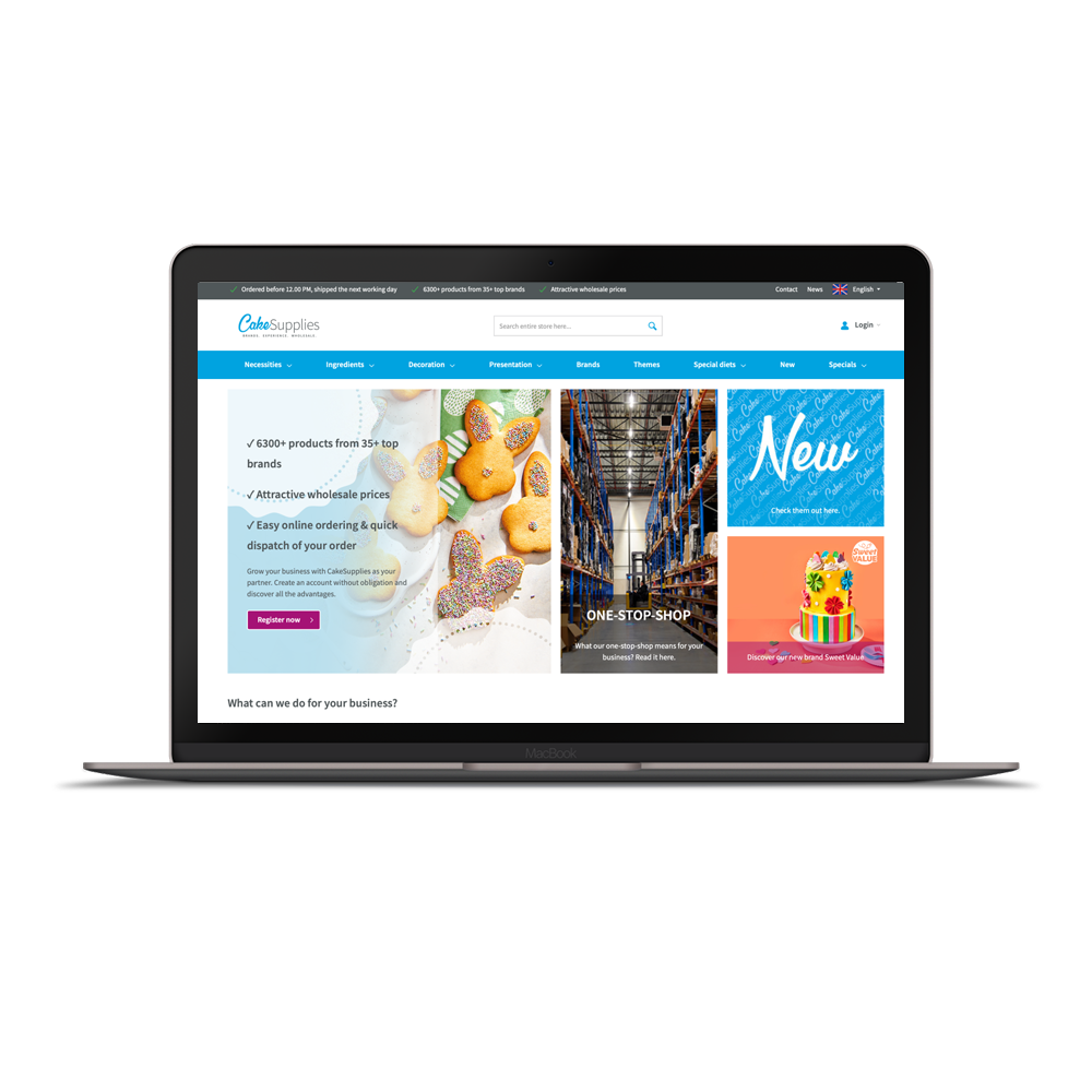 Al jaren zijn wij vooruitlopend op het gebied van online sales via ons B2B-platform. Onder onze doelgroep vallen professionele grootverbruikers, gespecialiseerde retailers die zich richten op de thuisbakmarkt en grote ketens in hobby, food en huishoudelijke artikelen. Binnen onze webshop staat easy ordering voorop en dankzij onze state-of-the-art-logistiek zijn wij perfect in staat iedereen van de (semi-)professionele taartdecorateur tot de grote winkelketen snel en uit voorraad te beleveren.